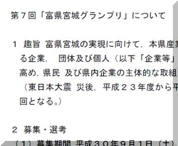 富県宮城の実現に向けて,本県産業の発展,地域経済の活性化に対する貢献が顕著である企業,団体及び個人を称えることにより,富県共創への関心を高め,県民及び県内企業の主体的な取組を促進することを目的として,平成20年度に創設。平成30年度は第7回となる。